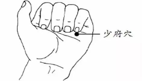 穴位位置:如图所示四指轻轻合拢,小指按着的位置就是少府穴。