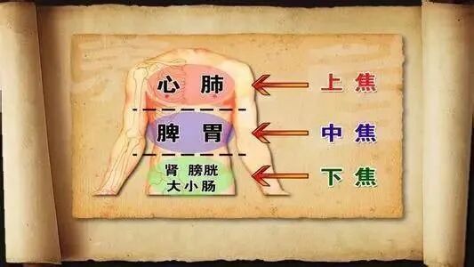 如果将躯干划分为3个部位,横膈以上内脏器官为上焦,包括心、肺;横膈以下至脐内脏器官为中焦,包括脾、胃、肝、胆等内脏;脐以下内脏器官为下焦,包括肾、大肠、小肠、膀胱。可以理解为三焦是五脏六腑外面的一层保护膜,保护着身体全部的内脏。