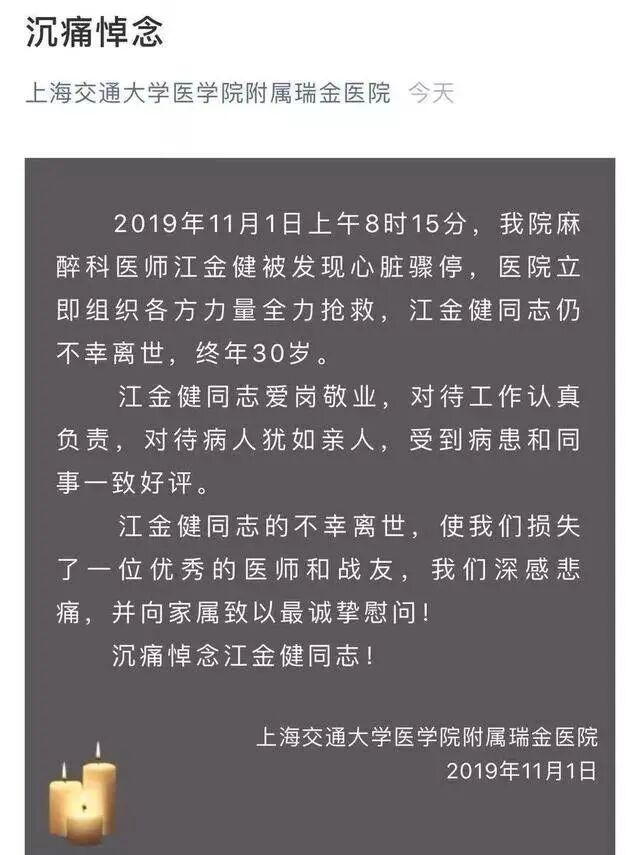 30岁的上海交大附属瑞金医院医生江金健,凌晨猝死在办公室里。